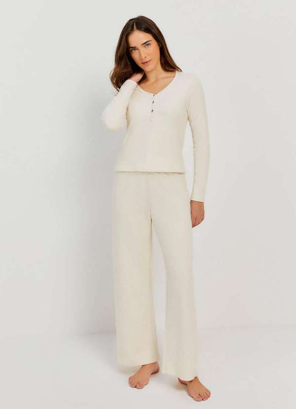 Hering - Pijama Longo Feminino Decote Henley Bege