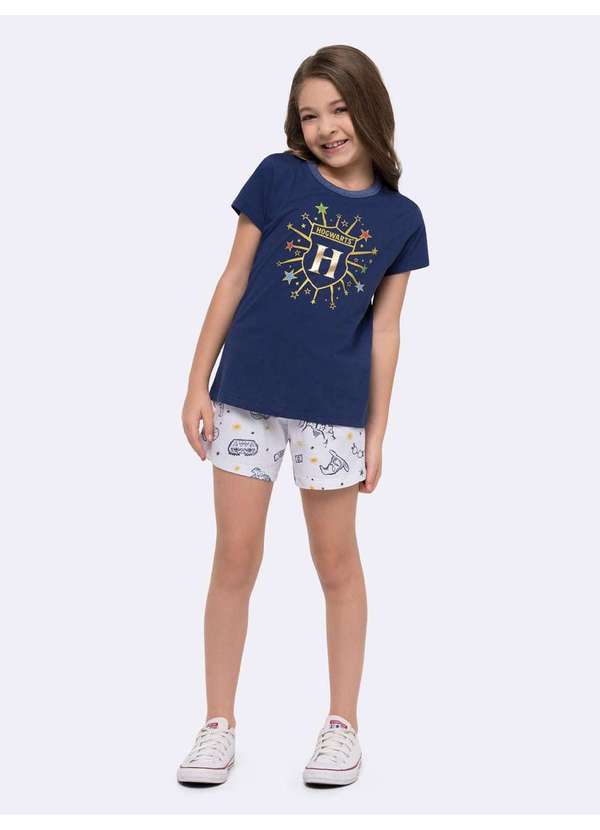 Veggi - Pijama Manga Curta Feminino Hogwarts Infantil com Estampa em Foil Azul
