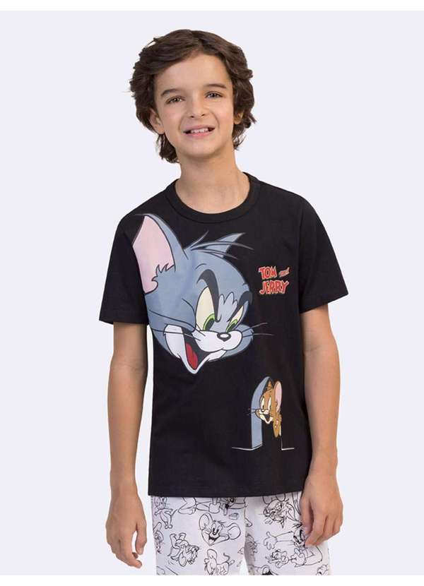 Veggi - Pijama Manga Curta Infantil Masculino com Calça Tom e Jerry Outli Preto