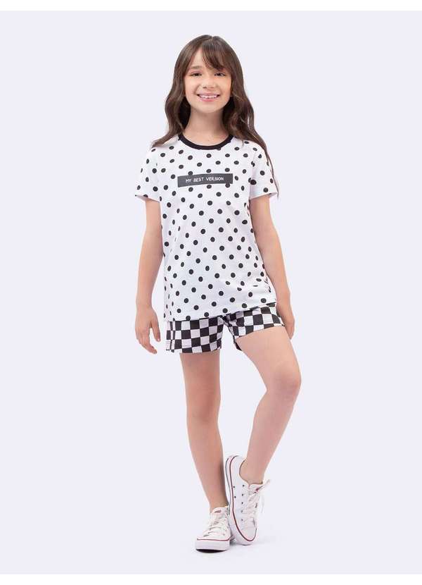 O Pijama Manga Curta Infantil Preto e Branco da Veggi é atemporal, lindo, confortável e sofisticado. Todo feito em malha 100% algodão a blusa possui estampa frontal localizada e estampa corrida com poás pretos. O short, com estampa de grid preto e branco forma o composê perfeito com a blusa, é fresquinho e confortável.