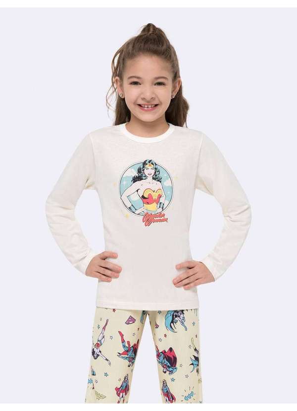 Veggi - Pijama Manga Longa Feminino Infantil Mulher-Maravilha Bege