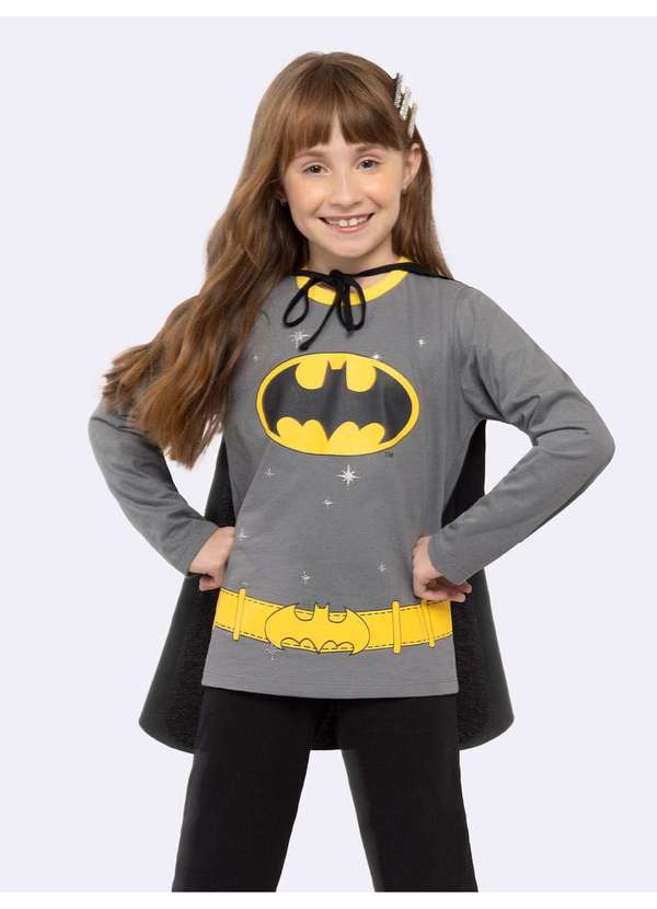 Veggi - Pijama Manga Longa Infantil Batgirl com Estampa com Glitter e Cap Cinza
