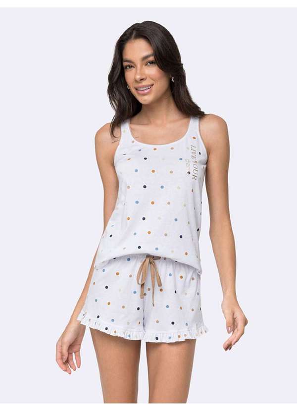 O Pijama Regata Raízes do Sol é confeccionado em 100% algodão, proporcionando frescor e toque macio para noites tranquilas. A estampa de poás multicoloridos espalha leveza e alegria pela peça, enquanto a frase ?Live Your Dreams? ganha destaque com aplicação em foil dourado, trazendo charme e brilho sutil. O short com cadarço e babadinhos na barra complementa o visual com romantismo e conforto. Um pijama encantador para quem ama os detalhes! Garanta já o seu e transforme o descanso em um momento de cuidado e estilo! ESTAMPA EM FOIL