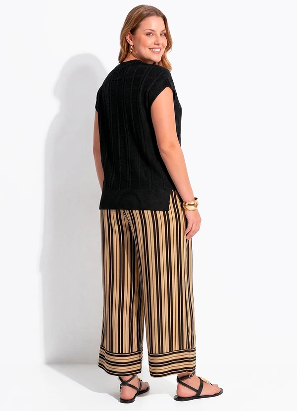 Blusa preta em tricot de acrílico, com caimento solto e trabalhados no ponto. Versátil, pode ser usada como blusa ou colete, criando looks modernos para trabalho ou lazer com conforto e estilo.