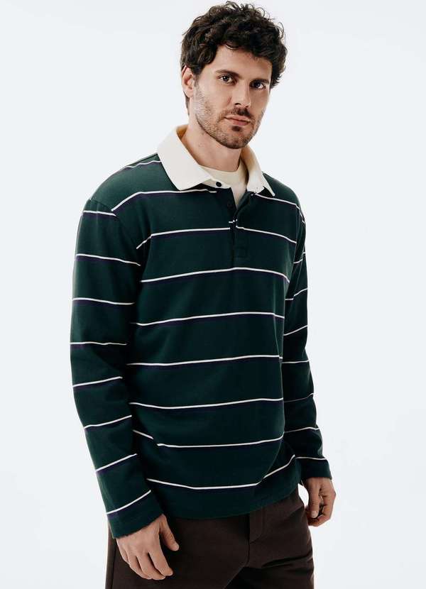 Polo confeccionada em moletom não peluciado com modelagem comfort, caimento levemente solto. Possui padronagem listrada, gola colarinho contrastante e vista com botões. Detalhes da peça: Moletom não peluciado Modelagem comfort Manga longa Gola colarinho Abotoamento frontal