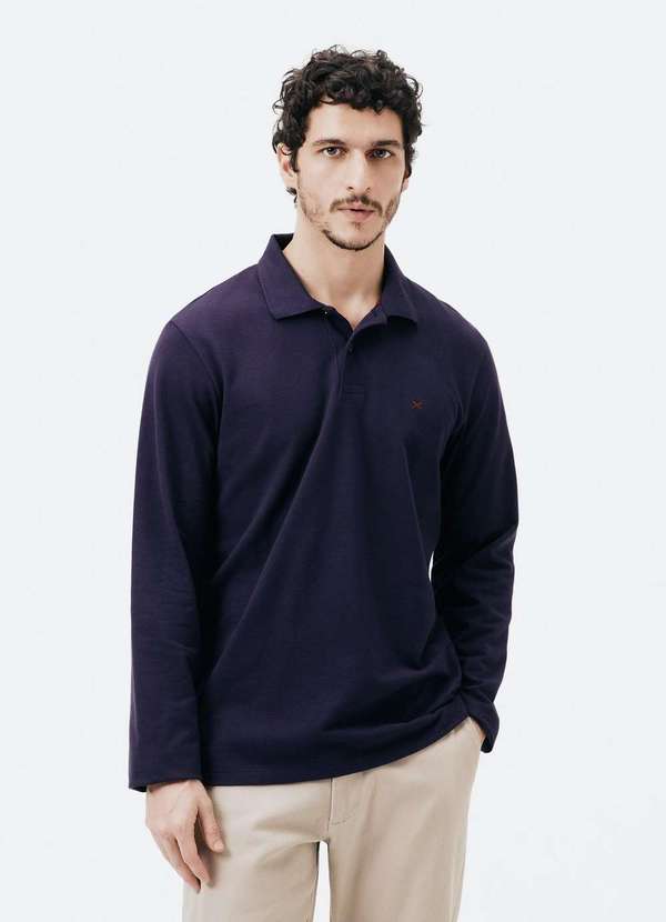Polo piquet regular, solta ao corpo. Possui manga longa, gola colarinho com retilínea e friso contrastante. Detalhe de bordado de peixinhos Hering frontal. Detalhes da peça: Em piquet Modelagem regular Manga longa Gola colarinho Bordado frontal Vista com botões