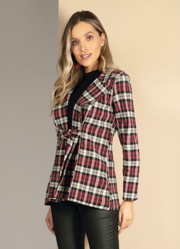 Quintess - Blazer Alongado Xadrez Bordô com Faixa