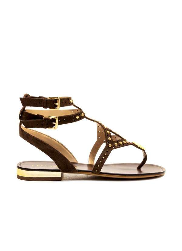 Delicada com atitude, esta sandália rasteira Cecconello combina conforto e estilo em cada detalhe. Confeccionada em couro, traz recortes a laser que conferem leveza visual e sofisticação. O destaque fica por conta do adorno de tachas metálicas douradas, que adicionam personalidade ao modelo. Características Material: Couro Material: Camurça Cor: Marrom ( Brownie ) Altura do salto: 2,5 cm .