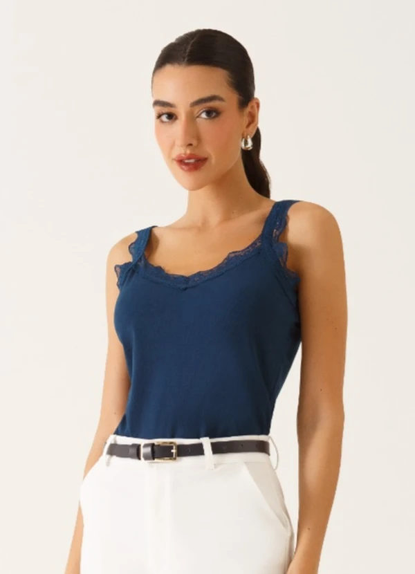 Principessa - Regata Alças com Renda em Viscose Canelada Marinho Ticiana