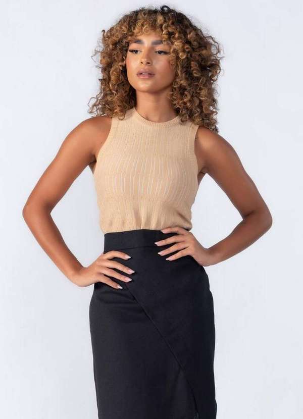 Regata alongada em tecido texturizado, com detalhe vertical Dica: Use a regata com um blazer alongado e uma calça flare para um visual chique e versátil. Composição: 65% viscose 35%poliamida Modelo: Tamanho p - Medidas 1,73 de altura | Peso: 58kg.
