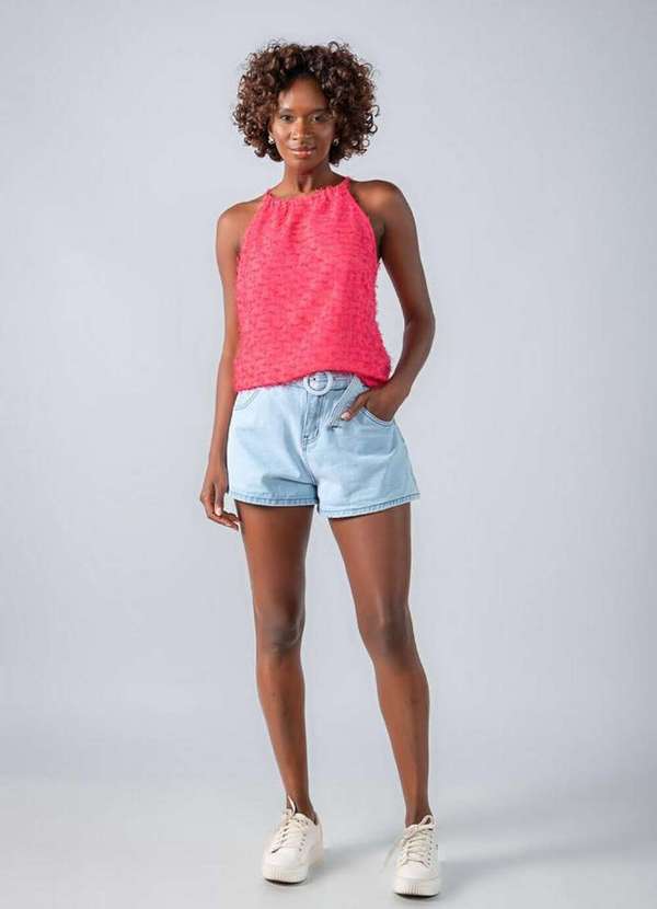 A regata com cava americana e detalhes em pelinhos no tecido é uma peça de roupa feminina elegante e estilosa, que combina um design moderno com elementos sofisticados. Essa combinação de características torna a regata uma opção versátil, podendo ser usada tanto em eventos mais formais quanto em ocasiões casuais que pedem um toque especial. A cava americana é uma característica da modelagem da regata, onde as alças possuem um corte mais amplo na parte dos ombros, expondo um pouco mais dessa região. Os detalhes em pelinhos no tecido são o elemento que acrescenta uma dose de elegância e textura à regata. Dica: Para um visual mais sofisticado, use com uma calça em P.U ou alfaiataria, com scarpins ou sandálias de salto alto. Para um visual casual use com jeans em tênis casuais. Composição: 100% Poliéster.