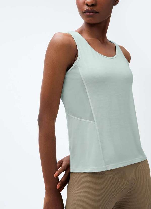 Regata básica confeccionada com tecnologia easy care, não amassa. Possui recorte lateral com detalhe em tule, alças médias e gola arredondada. Oferece toque macio, elasticidade e movimento. Detalhes da peça: Malha com elastano Modelagem regular Alças médias Decote redondo Detalhe de tule Não amassa