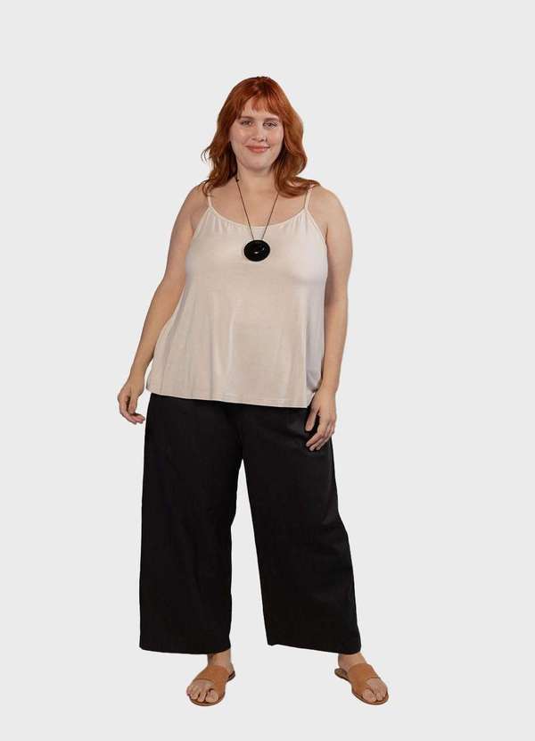 Regata em malha viscolycra plus size. Modelagem evasê. Alças finas. Medidas: G equivale 48/50 GG equivale 52/54 EXG equivale 56/58 Busto 120cm 128cm 136cm Cintura 120cm 128cm 136cm Quadril 160cm 168cm 176cm Comprimento 66cm 68cm 70cm