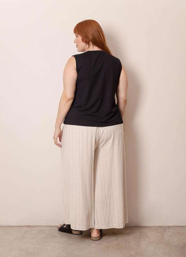 Regata plus size em malha. Modelagem evasê. Decote careca. Pequenas fendas laterais. Malha mais encorpada em viscose e elastano.