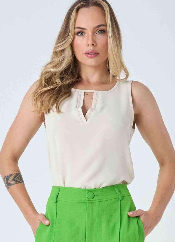 Regata confeccionada em tecido leve com superfície texturizada, cor bege, com toque macio, excelente caimento e que não amassa com facilidade. A peça possui modelagem solta, shape reto, cavas regulares, alças largas, decote redondo, detalhe de abertura em V com aplicação de bordado, comprimento tradicional e acabamento pespontado. Peças em tons de bege natural estão em alta nessa temporada, trazem leveza ao visual e combinam perfeitamente em qualquer ocasião do dia a dia. Aposte nessa regata elegante, com detalhe diferenciado de bordado no decote, para compor looks confortáveis e frescos para os dias de calor. Combine com a saia midi ou calça wide leg bege da mesma coleção para um visual monocromático cheio de estilo.