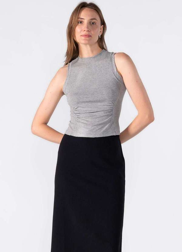 Regata em malha com franzido acinturado Dica: Usar com saia midi e sandália Composição:95%viscose 05%elastano Modelo usa:Tamanho P - Medidas 1,75 de altura | 62kg