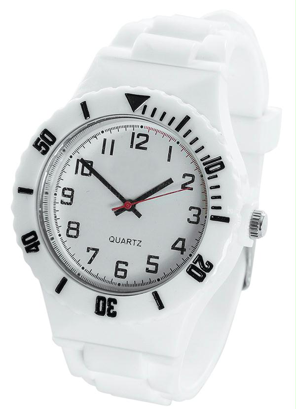 Relógio Unissex, confeccionado em plástico com metal prateado.