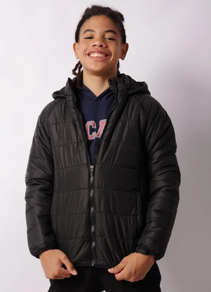 Jaqueta Juvenil Puffer com Bolsos e Capuz Preta