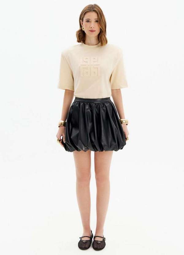 Com design marcante, a saia curta com modelagem balonê de pu une modernidade e tendência. O caimento descolado garante estilo e a cintura alta destaca a silhueta. Perfeita uma produção cheia de atitude.