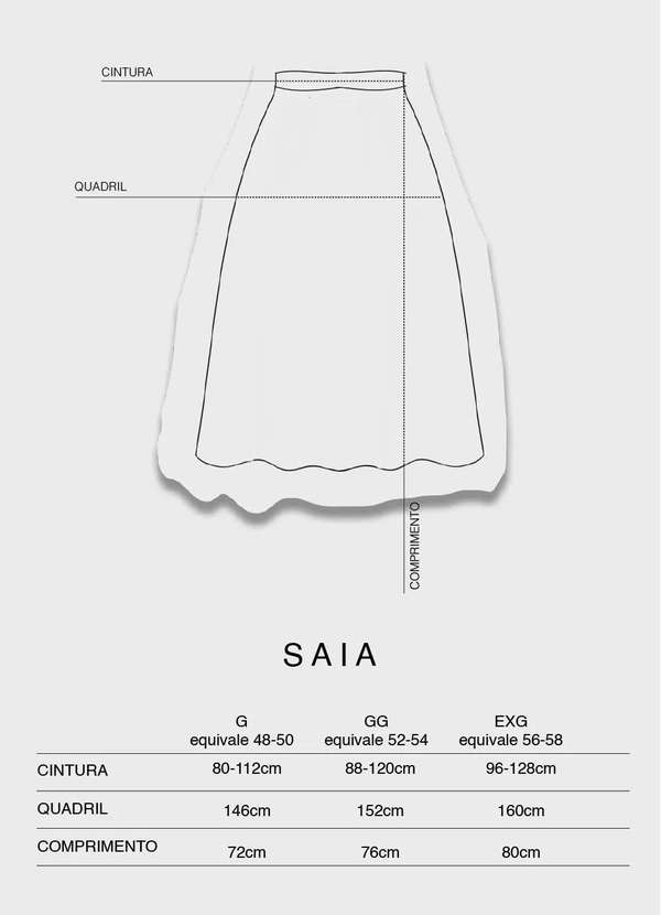 Saia plus size em viscose. Modelagem evasê. Elástico no cós. Bolsos nas laterais. Frente com vista falsa e botões. Observação: Essa peça passou por processo de lavagem e não sofrerá encolhimento. Sugerimos lavar essa peça em água fria e à mão. Se optar pela máquina, use o modo delicado. Isso irá garantir bons resultados finais e uma maior durabilidade da sua peça. Não usar secadora. Não aceitamos devoluções de peças usadas. Medidas: G equivale 48-50 GG equivale 52-54 EXG equivale 56-58 Cintura 80-112cm 88-120cm 96-128cm Quadril 146cm 152cm 160cm Comprimento 72cm 76cm 80cm
