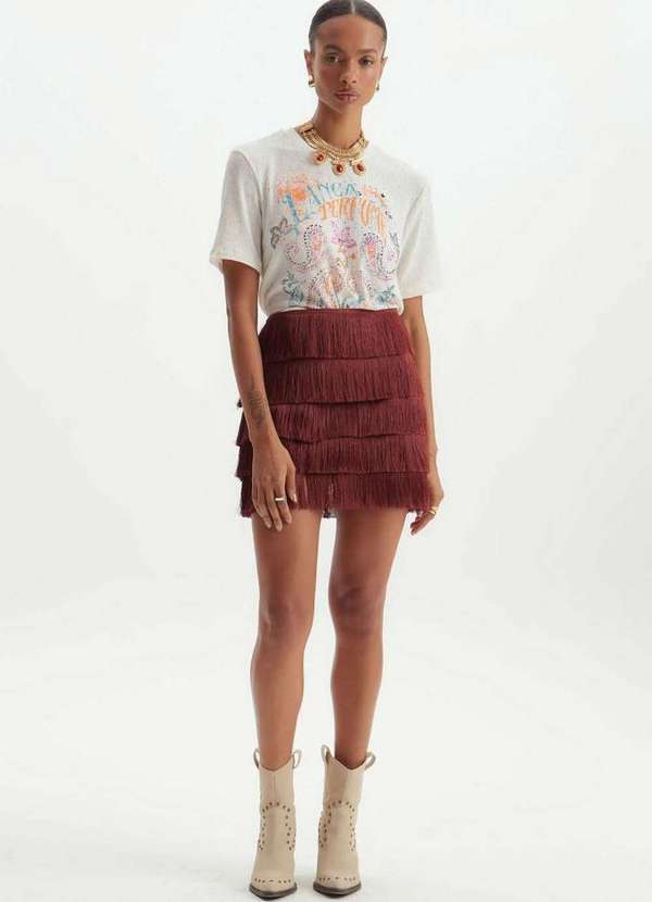 Confeccionada em franjas, a saia feminina em modelagem curta é uma peça deslumbrante e moderna, perfeita para ocasiões noturnas. Possui cintura alta, caimento comfy e detalhes para trazer mais movimento aos seus looks. Aposte!