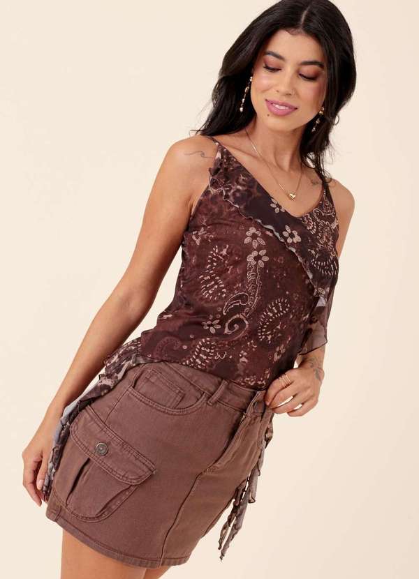 Pop Me - Saia Curta em Sarja Bolso Cargo Marrom