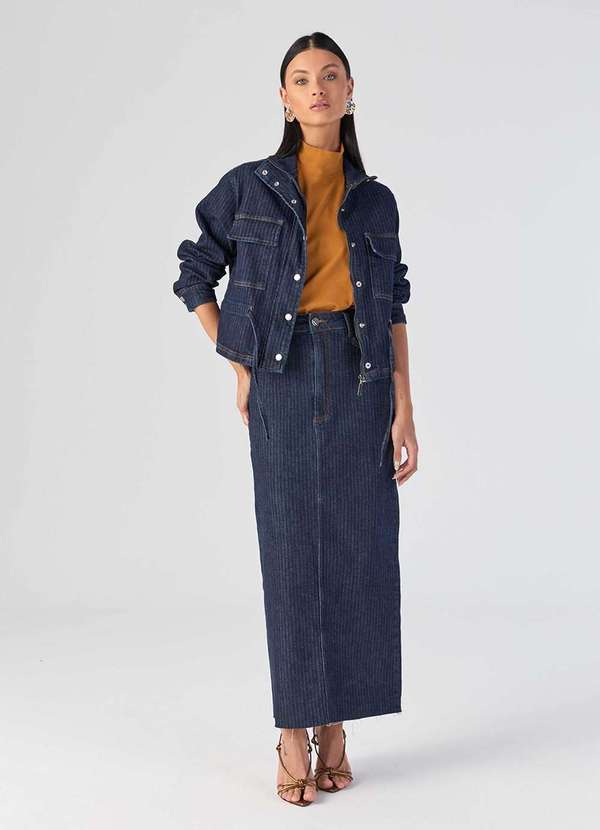 Laccord - Saia Jeans Midi com Fenda Risca de Giz Azul