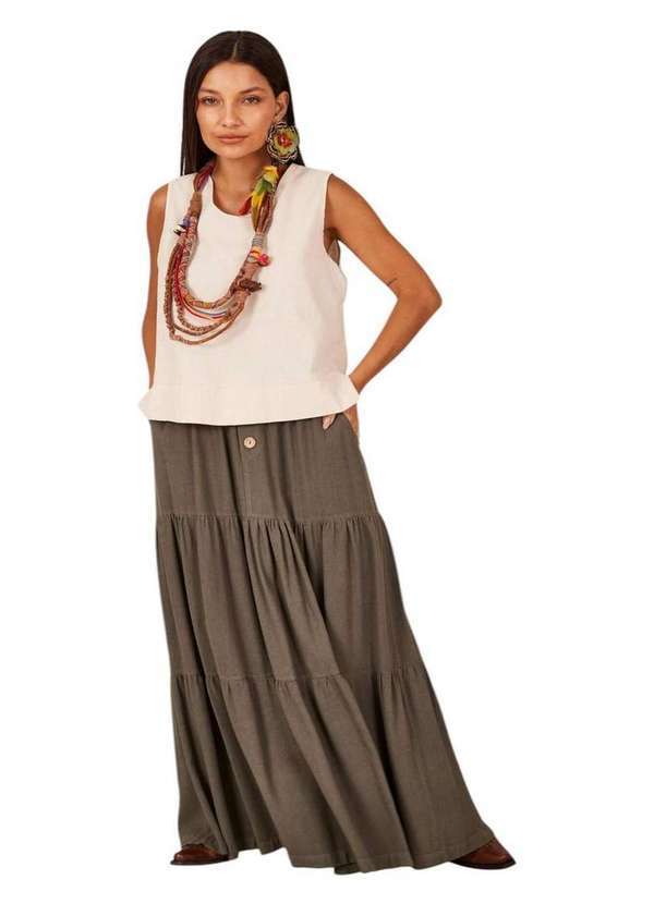 Conforto e Estilo para Todas as Ocasiões A Saia Longa de Linho Modelo 3 Marias Verde Escuro Yacamim é a peça ideal para quem busca um visual sofisticado e cheio de movimento. Seu modelo 3 Marias com babados cria um caimento fluido e leve, perfeito para o dia a dia ou ocasiões especiais. O elástico na cintura garante um ajuste confortável, enquanto os botões de coco na frente adicionam um toque rústico e delicado. Os bolsos complementam a peça com funcionalidade e estilo. Características do Produto: Modelo 3 Marias: Camadas de babados que garantem leveza e movimento Babados: Detalhes femininos e elegantes que criam um visual único Bolsos: Praticidade e estilo em uma única peça Elástico na Cintura: Conforto e ajuste perfeito Botões de Coco na Frente: Toque natural e artesanal que valoriza o design Cor Verde Escuro: Tons sóbrios e versáteis, ideais para diversas combinações Composição do Tecido: 70% Viscose 25% Linho 5% Algodão .