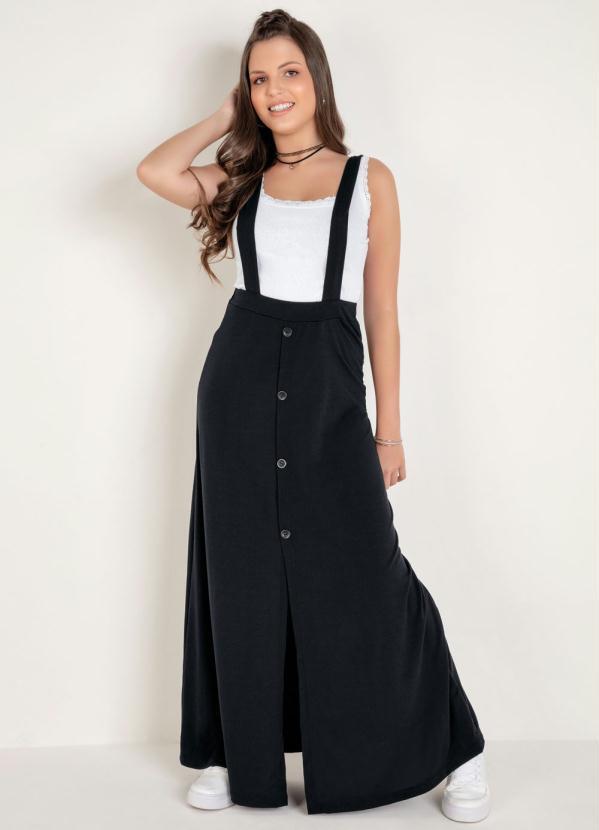 Saia em malha de poliéster e elastano. Com alças, elástico na cintura, vista decorativa centralizada na frente com 4 botões, fenda centralizada. Cintura alta. Comprimento longo.