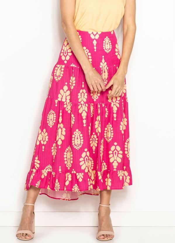 Maria Filó - Saia Midi de Viscose Estampa Pingo Hibisco Rosa