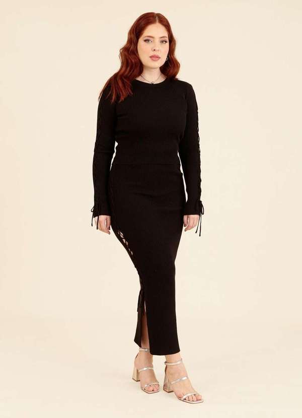 Pop Me - Saia Midi em Trico com Trancado Lateral Preto