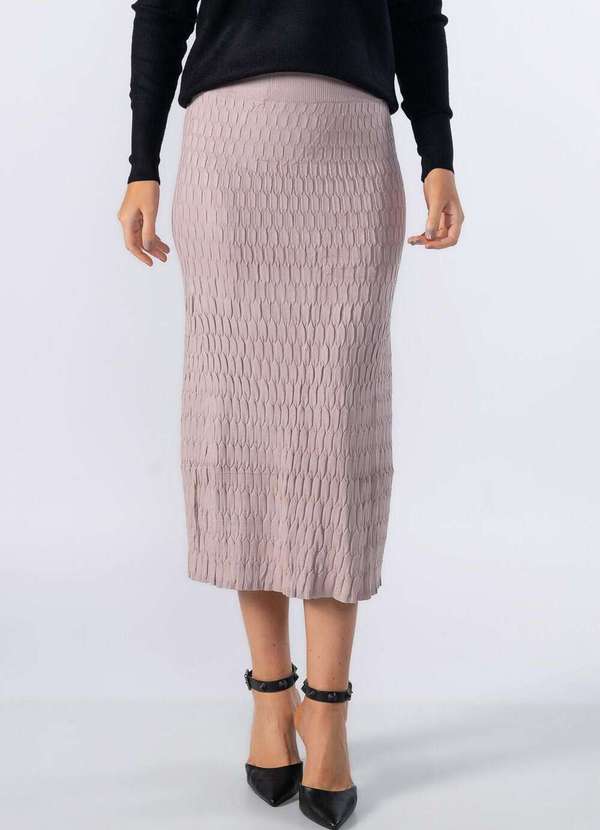 Saia midi com tecido trabalhado e cós canelado com elástico Dica: Usar com camisa e blazer Composição: 40%viscose 30%poliamida 30%poliester Modelo usa:Tamanho P -Medidas 1,75 de altura | 60kg.