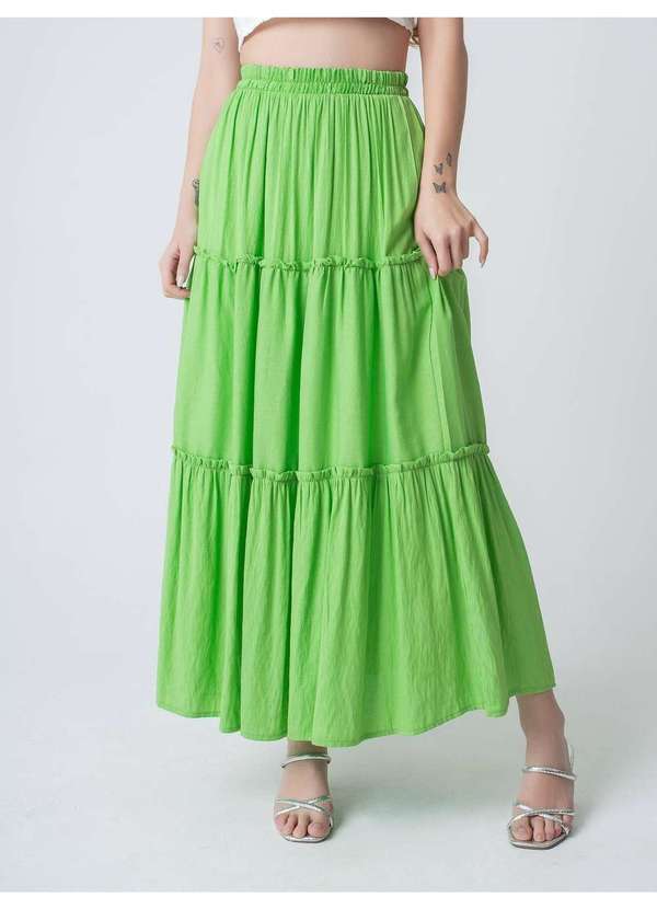 Saia longa modelagem rodada, também conhecida como três marias. É confeccionada em tecido leve, possui forro e cós com elástico, trazendo conforto ao utilizar a peça. Aposte em croppeds e sandálias para compor um look de verão super moderno!
