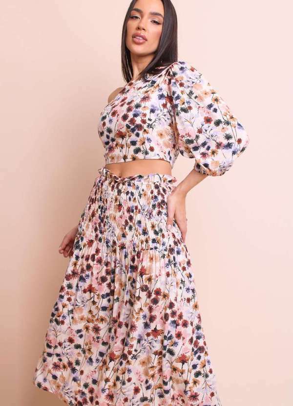 Pequia - Saia Viscose Midi Pincelada Floral Pequia Bege