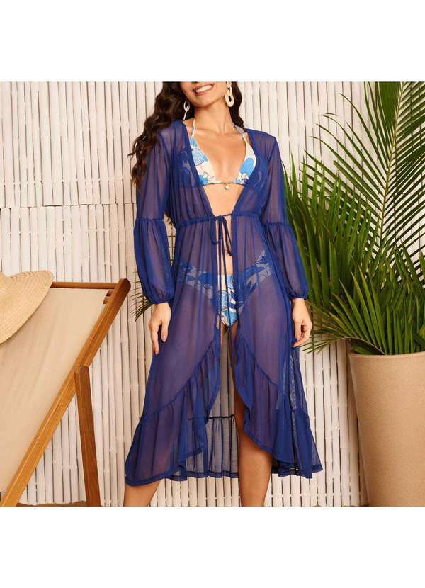 Donna Carioca - Saída de Praia Manga Longa Midi de Tule Marinho Azul