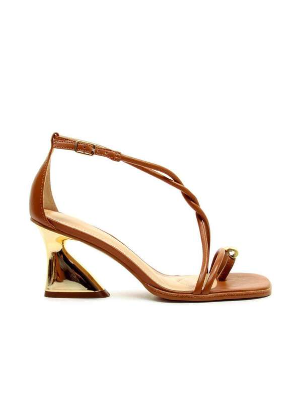 Um ícone de elegância moderna, esta sandália traz um design minimalista que impressiona pelos detalhes refinados. As tiras finas e delicadamente torcidas envolvem o pé com leveza e estilo, enquanto o adorno metálico dourado no dedo adiciona um charme contemporâneo e sutil. O salto escultural, em acabamento espelhado dourado, transforma o modelo em uma verdadeira peça de arte ¿ sofisticada, ousada e perfeita para ocasiões que pedem presença e personalidade. Um toque de luxo para looks urbanos e noturnos. Características Material: Couro Venetto Cor: Marrom ( Chestnut ) Altura do salto: 7,5cm .