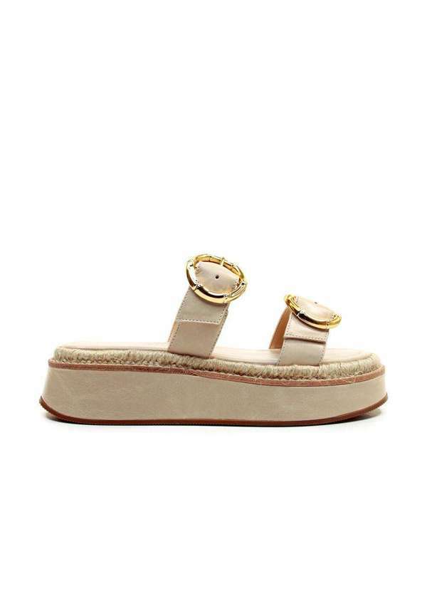 Sandália flatform confeccionada em couro, que combina estilo moderno e sofisticação. O design conta com duas tiras largas, cada uma adornada por uma imponente fivela estilizada, que agrega personalidade e charme à peça. O detalhe em corda de rami na vira da palmilha traz um toque natural e artesanal, equilibrando o visual contemporâneo com elementos orgânicos. Ideal para quem busca um calçado versátil, confortável e repleto de estilo, perfeito para compor looks elegantes e despojados. Características Material: Couro Torino Cor: Off White Altura do salto: 5,0cm .