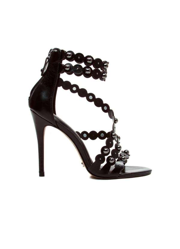Com um design sofisticado e detalhes marcantes, esta sandália em couro se destaca pelos recortes precisos em corte a laser, criando um visual exclusivo. As tiras transversais envolvem o pé com elegância, enquanto o traseiro alto com tornozeleira garante um ajuste seguro e refinado. As semi-esferas cromadas adicionam um toque de brilho moderno, enriquecendo o design. O bico redondo proporciona conforto, enquanto o salto alto fino traz sofisticação e elegância, finalizando a composição com um toque de glamour. Características Material: Couro Torino Cor: Preto Altura do salto: 11cm .