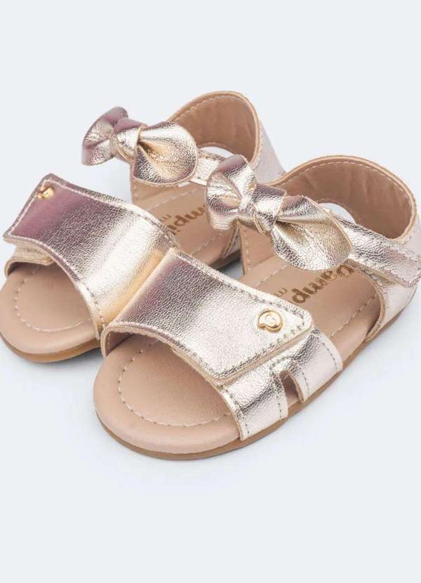 Sandália dourada para bebê, um charme que combina conforto e versatilidade. Possui laço frontal removível, permitindo usar de duas formas diferentes, tornando o visual ainda mais delicado e encantador. A palmilha é macia, forrada e com enchimento de espuma, garantindo aconchego aos pezinhos sem atrapalhar o desenvolvimento natural. Com fecho de contato, é prática de calçar e perfeita para facilitar a rotina da mamãe. O solado emborrachado e flexível proporciona segurança e estabilidade para a menina explorar seus primeiros passinhos com confiança.