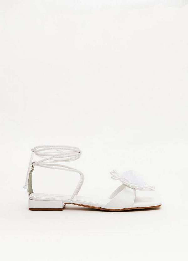 Aposte na elegância da sandália rasteira com amarração. Com aplicação de flor delicada e bico quadrado moderno, esse calçado é perfeito para adicionar um toque romântico e estiloso ao seu look.
