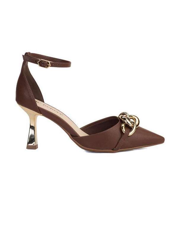 Scarpin semi aberto com estilo sofisticado, detalhe de maxi corrente com visual 'bold' e fivela de metal com design discreto. O forro é em tecido cacharel com espuma que em conjunto com a palmilha proporciona muito conforto. O salto alto pintado traz o formato flare, muito feminino e atemporal.