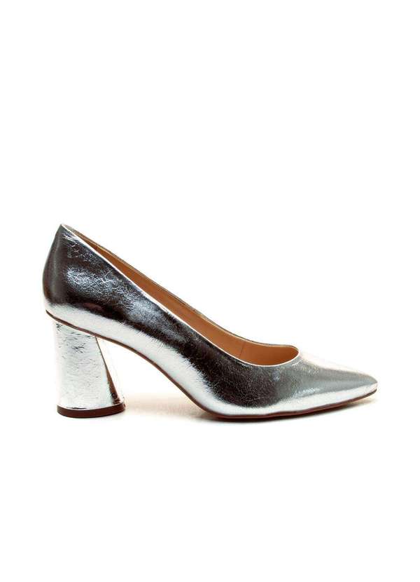 Design único e completamente sofisticado! O destaque deste modelo é o seu shape clean com o conforto do salto bloco,modelo certeiro para quem busca conforto mas não abre mão da modernidade e elegância. Aproveite! Características Material: Couro Metal Bala Cor: Prata Altura do salto: 7,5cm .
