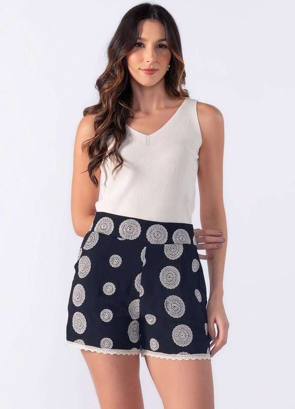 Short bordado com renda na barra zíper lateral e bolsos Dica: Usar com blusa básica e sandália Composição: 100% viscose |Forro: 100% poliéster Modelo usa:Tamanho P - Medidas 1,75 de altura | Peso: 60k