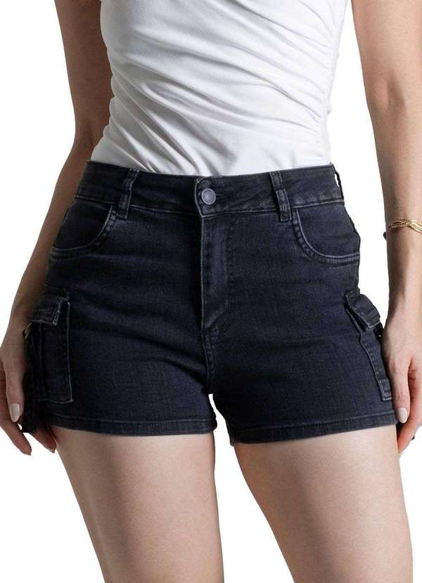 Shorts confeccionada em jeans. Modelagem soltinho. Cintura média Fechamento com botão e zíper Bolsos frontais e bolsos traseiros funcionais bolsos laterais cargo Barra simples Tecido: Jeans Tipo de lavagem: Marmorizada Cor: PretoComposição: 77% ALGODÃO 20% POLIÉSTER 3% ELASTANO