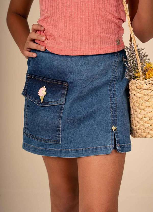 Ok e Pakita - Shorts Saia com Bolso Frontal em Denim Pakita Jeans