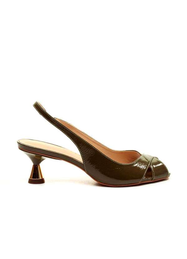 Slingback confeccionado em couro, com um design moderno e elegante. O bico quadrado aberto traz um toque contemporâneo, enquanto o cabedal em X proporciona sofisticação e um ajuste perfeito ao pé. O elástico na parte traseira garante praticidade e conforto ao calçar. Para um acabamento refinado, o modelo conta com um salto baixo bipartido com efeito escultural e acabamento cromado ouro, adicionando um toque de brilho sutil e sofisticado. Características Material: Couro ( Verniz Glossy ) Cor: Verde ( Oliva ) Altura do salto: 5,0cm .
