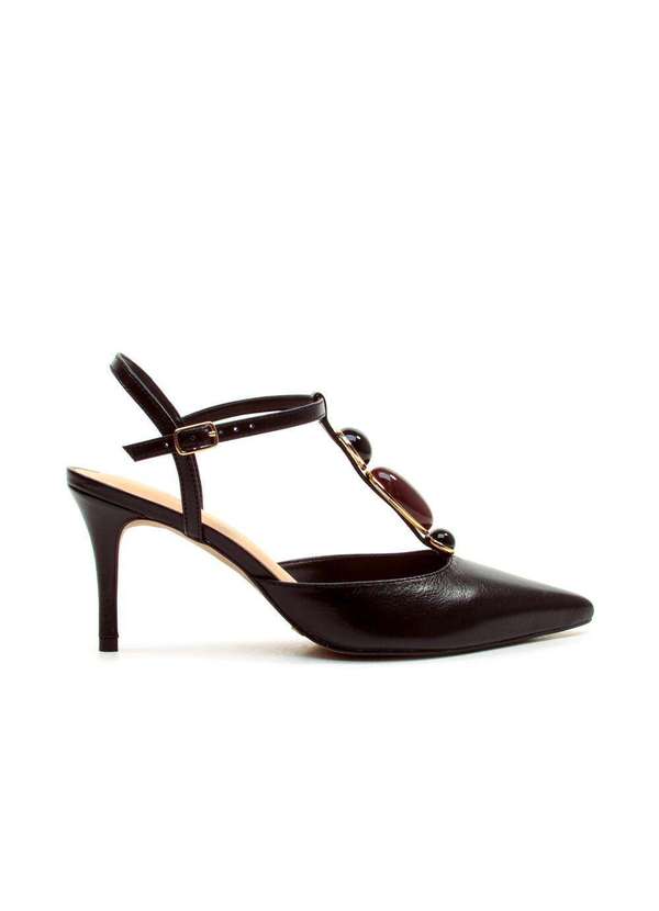Clássico com um toque contemporâneo, este scarpin slingback em couro preto é a escolha ideal para ocasiões que pedem sofisticação com personalidade. O design de bico fino alonga a silhueta e confere elegância instantânea, enquanto a tira central com pedrarias em tons escuros e acabamento dourado adiciona um toque de glamour na medida certa. O salto fino proporciona altura com leveza e o fechamento com fivela garante ajuste delicado e seguro. Um modelo versátil que transita com naturalidade entre eventos sociais, ambientes profissionais e produções refinadas no dia a dia. Características Material: Couro Venetto Cor: Preto Altura do salto: 7,5 cm .