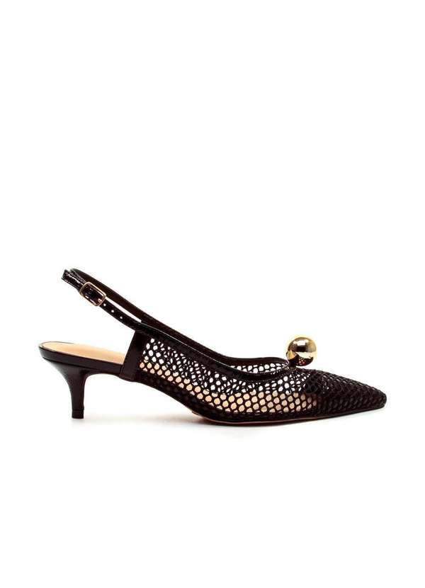 Este slingback une sofisticação e modernidade com maestria. Confeccionado em couro com acabamento envernizado, traz o charme da tela em padrão vazado que revela delicadamente os pés. O design de bico fino é valorizado por uma esfera metálica dourada, adicionando um toque escultural e ousado à composição. O salto baixo e fino garante conforto com elegância, enquanto a tira com fivela no tornozelo proporciona ajuste seguro. Uma escolha perfeita para produções urbanas e contemporâneas. Características Material: Couro ( Tela ) Cor: Preto Altura do salto: 5,0cm .