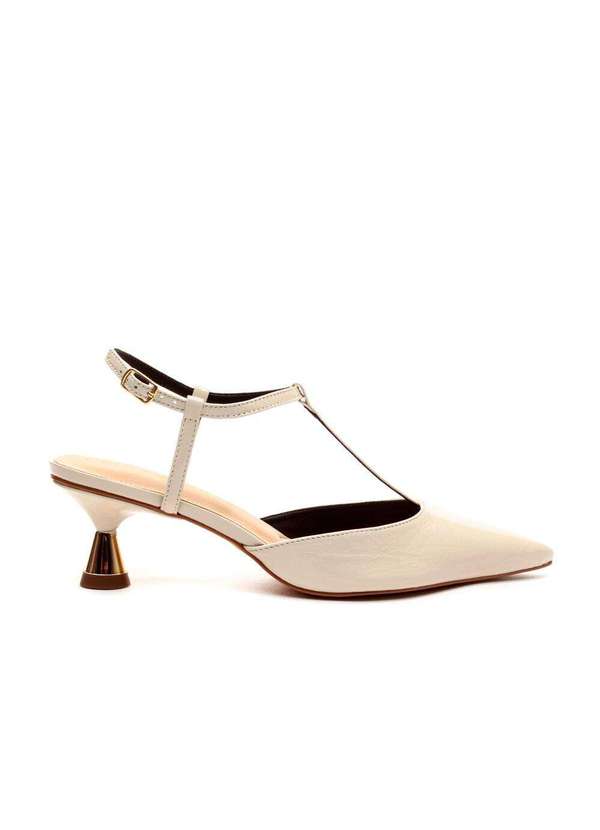 Slingback confeccionado em couro, com design elegante que destaca o bico fino e uma delicada salomé, conferindo charme e sofisticação. A tornozeleira com fechamento ajustável por fivela garante segurança e conforto ao calce. Para finalizar, o modelo conta com um salto médio escultural, adornado com um refinado acabamento cromado, que acrescenta um toque moderno e luxuoso. Uma peça perfeita para compor looks sofisticados e versáteis. Características Material: Couro ( Verniz Glossy ) Cor: Off White Altura do salto: 6,0 cm .