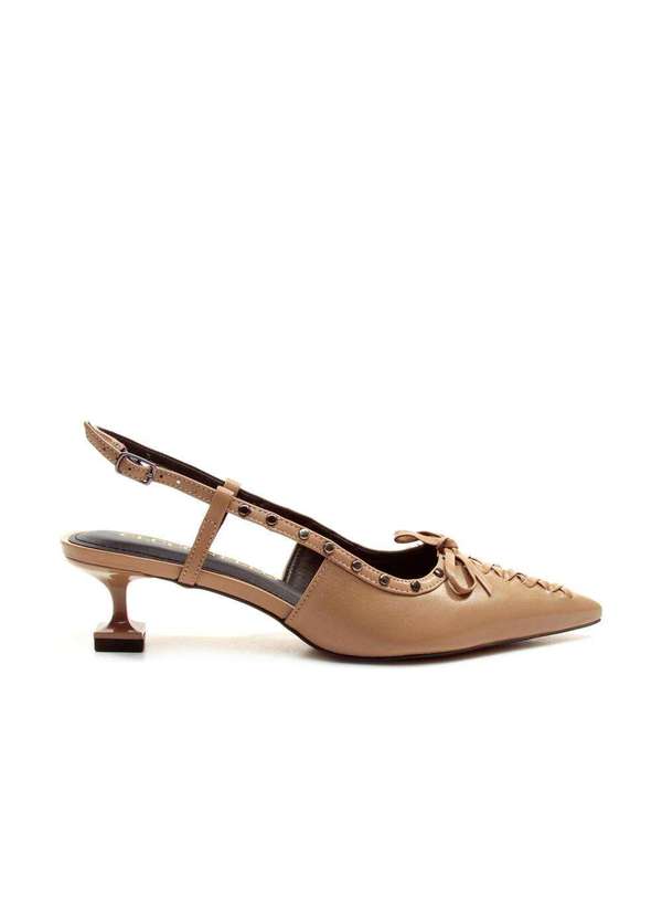 Este slingback de couro é a escolha perfeita para quem busca elegância com um toque moderno. O modelo apresenta adornos de ilhós metálicos, acrescentando um detalhe sofisticado e contemporâneo. Com um salto baixo, oferece conforto durante todo o dia sem comprometer o estilo. A tira slingback ajustável garante um ajuste seguro e personalizado. Ideal para diversas ocasiões, desde o trabalho até eventos sociais casuais, este slingback é versátil e elegante, complementando qualquer look com um toque refinado. Características Material: Couro Cor: Marrom ( Amêndoa ) Altura do salto: 4,5cm .